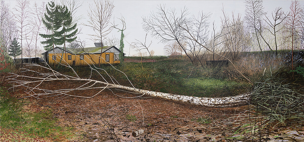 'Umgestürtz', 2022 Olie, acryl og tempera på lærred 140x295 cm | Trapholt